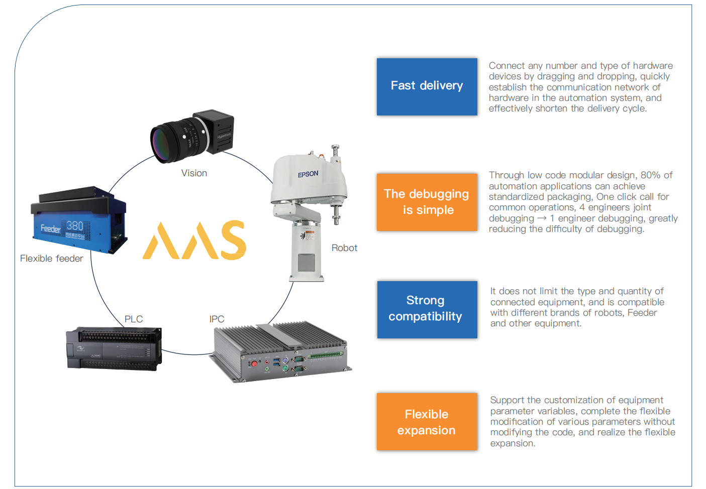 The Flexible Feeding Station is managed through our proprietary AAS integrated software for unified control. It enables one-click communication among vision systems, flexible vibratory feeders, robotic arms, PLCs, and industrial PCs, facilitating the rapid construction of automation applications. This significantly reduces the integration cycle and debugging complexity of flexible feeding systems, thereby lowering costs.